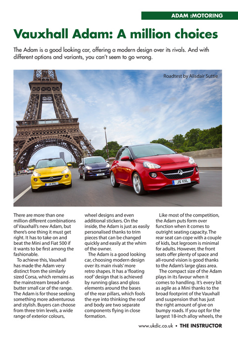 There are more than one million different combinations of Vauxhall’s new Adam, but there’s one thing it must get right. It has to take on and beat the Mini and Fiat 500 if it wants to be first among the fashionable. To achieve this, Vauxhall has made the Adam very distinct from the similarly sized Corsa, which remains as the mainstream bread-andbutter small car of the range. The Adam is for those seeking something more adventurous and stylish. Buyers can choose from three trim levels, a wide range of exterior colours,