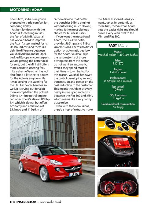 ride is firm, so be sure you’re prepared to trade comfort for cornering ability. A slight let-down with the Adam is its steering misses the feel of a Mini’s. Vauxhall has worked hard to improve the Adam’s steering feel for its UK-bound cars and there is a definite difference between Vauxhall Adams and its Opelbadged European counterparts. We are getting the better deal, for sure, but the Mini still offers more accurate steering feel. It’s a shame Vauxhall has not also found a little extra power for the Adam’s engine while it was sorting the steering for the UK. As the car handles so well, it is crying out for a bit more oomph than the pokiest 99bhp 1.4-litre petrol engine can offer. There’s also an 86bhp 1.4, which is slower but offers economy and emissions of 55.4mpg and 119g/km of carbon dioxide that better the punchier 99bhp engine’s without feeling much slower, making it the most obvious choice for business users. If you want the most frugal Adam, the 1.2-litre petrol provides 56.5mpg and 118g/ km emissions. There’s no diesel option or automatic gearbox for the Adam. Vauxhall says the vast majority of those driving cars from this sector do not want an automatic, even if they spend most of their time in town traffic. For this reason, Vauxhall has saved the cost of developing an auto transmission and passes on the cost reduction to the customer. This means the Adam sits very neatly in size, spec and costs between the Fiat 500 and Mini, which seems like a very canny place to be. Even with these omissions, there’s a host of extras to make the Adam as individual as you want. Just as importantly as these frills, the Vauxhall Adam gets the basics right and should prove a very keen rival to the Mini and Fiat 500.