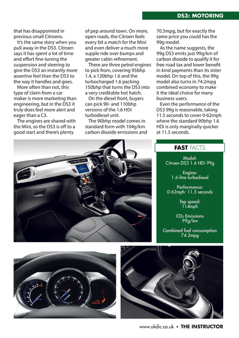 Model: Citroen DS3 1.6 HDi 99g Engine: 1.6-litre turbodiesel Performance: 0-62mph: 11.5 seconds Top speed: 114mph CO2 Emissions 99g/km Combined fuel consumption 74.2mpg