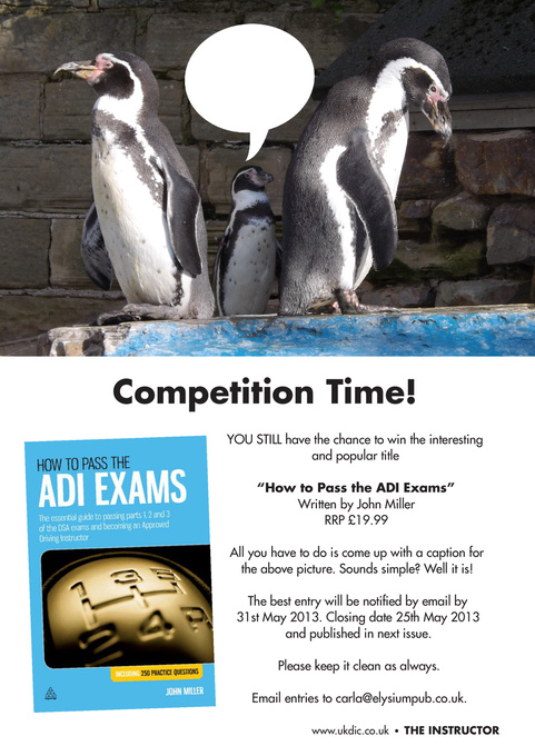 YOU STILL have the chance to win the interesting and popular title “How to Pass the ADI Exams” Written by John Miller RRP £19.99 All you have to do is come up with a caption for the above picture. Sounds simple? Well it is! The best entry will be notified by email by 31st May 2013. Closing date 25th May 2013 and published in next issue. Please keep it clean as always. Email entries to carla@elysiumpub.co.uk.