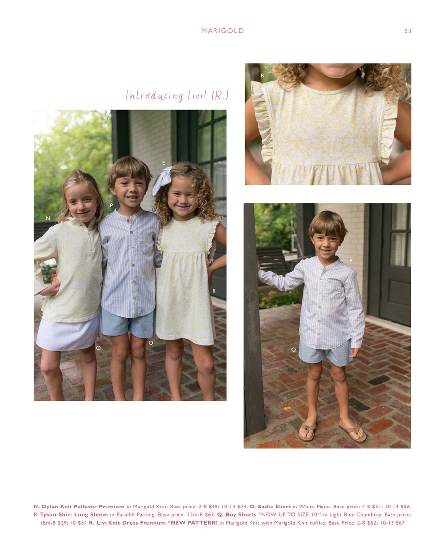 N. Dylan Knit Pullover Premium in Marigold Knit. Base price: 2-8 $69; 10-14 $74. O. Sadie Skort in White Pique. Base price: 4-8 $51; 10-14 $56. P. Tyson Shirt Long Sleeve in Parallel Parking. Base price: 12m-8 $63. Q. Boy Shorts *NOW UP TO SIZE 10!* in Light Blue Chambray. Base price: 18m-8 $29; 10 $34 R. Livi Knit Dress Premium *NEW PATTERN! in Marigold Knit with Marigold Knit ruffles. Base Price: 2-8 $62; 10-12 $67
