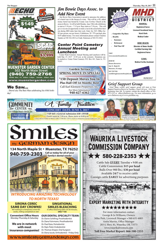 Grief Share weekly grief support group will meet at First Baptist Church in Bowie on Tuesdays, from 6:00 p.m. - 8:00 p.m. beginning June 6th. To register, contact the church office at 940872-1193 or office@fbcbowie.org. For more information, go to www.fbcbowie.org or www.griefshare.org.