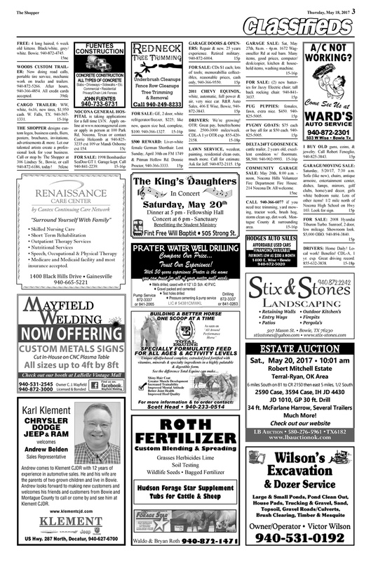 FREE: 4 long haired, 6 week old kittens. Black/white, grey/ white. Bowie. 940-872-4745. 15nc WOODS CUSTOM TRAILER: Now doing road calls, portable tire service, mechanic work on trucks and trailers. 940-872-5266. After hours, 940-366-4854. All credit cards accepted. 39tfc CARGO TRAILER: WW, white, 6x16, new tires, $1,950 cash. W. Falls, TX. 940-5071331. 15-16p THE SHOPPER designs custom logos, business cards, fliers, posters, brochures, invitations, advertisements & more. Let our talented artists create a professional look for your business. Call or stop by The Shopper at 306 Lindsey St., Bowie, or call 940-872-6186, today! 5tfcnc