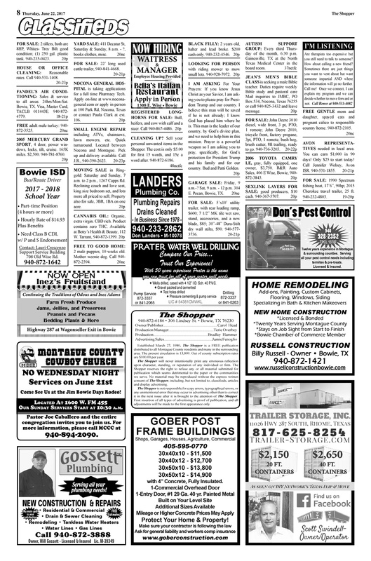 Established March 27, 1980, The Shopper is a FREE publication distributed to all Montague County residents and many in the surrounding area. The present circulation is 13,809. Out of county subscription rates are $100.00 per year. The Shopper will never intentionally print any erroneous reflection upon character, standing, or reputation of any individual or firm. The Shopper reserves the right to refuse any or all material submitted for publication which seems detrimental to the paper or the communities we serve. No material may be reproduced without the express written consent of The Shopper, including, but not limited to, classifieds, articles and display advertising. The Shopper is not responsible for copy errors, typographical errors, or any unintentional error that may occur in advertising other than to correct it in the next issue after it is brought to the attention of The Shopper. First insertion of all types of advertising is proof of publication, and all adjustments will be made to the first appearance only.