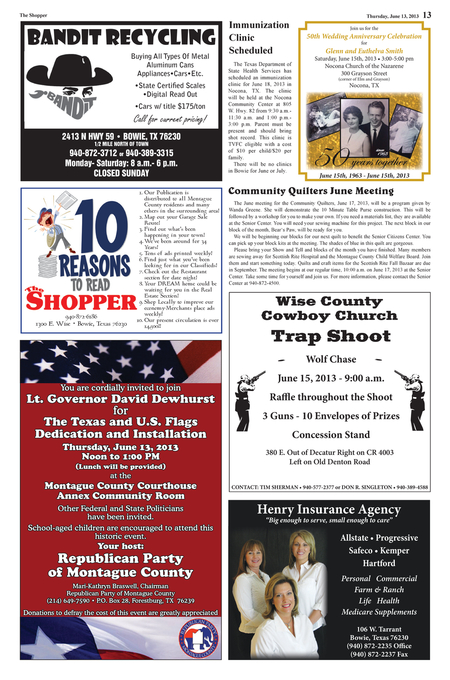 1. Our Publication is distri buted to all Montague County residents and many others in the surrounding area! 2. Map out your Garage Sale Route! 3. Find out what’s been happening in your town! 4. We’ve been around for 34 Years! 5. Tons of ads printed weekly! 6. Find just what you’ve been looking for in our Classifieds! 7. Check out the Restaurant section for date night! 8. Your DREAM home could be waiting for you in the Real Estate Section! 9. Shop Locally to improve our economy-Merchants place ads weekly! 10. Our present circulation is over 14,500!!