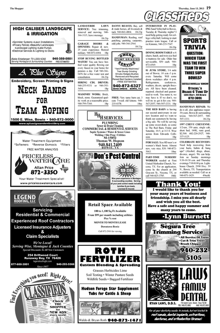 STOP BUYING BOTTLED WATER! You can have bottled water quality flowing out every faucet in your home for pennies a day. Call 940-3660476 for a free water test and consultation. 18-23p HIRING CDL DRIVER: 940-255-9331 or 940-3935494. 18p MASONRY WORK: Brick, block, stone. Guaranteed quality work at a reasonable price. 940-799-7360. 18p