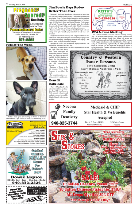 PLUMBING AND This year’s Jim Bowie Days Rodeo will prove to be better than SEPTIC SERVICE ever! The Association will host the first United Professional Rodeo NOCONA, Association, Texas Cowboys Rodeo Association and International TX Pro Rodeo Association Rodeo offering added money of $500 per event, $250 for Ranch Bronc and Double Mugging. Performances M-36097 will be held Thursday, Friday and Saturday at the Bowie Rodeo TCEQ 22704 Grounds and will begin at 8 p.m. each night. If slack is necessary, it will be held Thursday and Friday after the performance. Saturday will be “Tough Enough to Wear Pink” night with percentage of the gate proceeds going to a charity to help find a cure for cancer. The Chisholm Trail Art Association will meet Thursday evening, Top professional rodeo cowboys will compete in bareback and June 13th, at Ozona Bank in Bowie. Guest speaker will be Wichita saddle bronc riding, bull riding and steer wrestling. Roping events Falls artist and educator, Ronda Ivey. Ronda will present her will include calf roping, team roping and breakaway roping. Com- artwork and photography, and talk about her successful art program petitive barrel racing is offered for cowgirls. which engages and educates youth and adults alike. Doors open at There will be a dance after the Saturday night performance. The 5:30 p.m. A short meeting begins at 6:00 p.m. and the presentation band will be announced at a later date. begins at 6:30 p.m. All area artists and art lovers are invited to Tickets are $8 this year and can either be purchased by a Miss attend this program. For more information on the CTAA visit www. chisholmtrailartists.com. and Little Miss Jim Bowie Days Queen contestants all through the month of June or at the gate. Box seats are still available for $100. Parking is always free. For information on obtaining a box seat this year, visit www.jimbowiedays.org. Patterson of Bowie is the title sponsor, T-N-T Rodeo Company is providing the Dances taught are: Cost is $5 stock. For more information on enTwo Step per person tering, visit www.urodeo.com.
