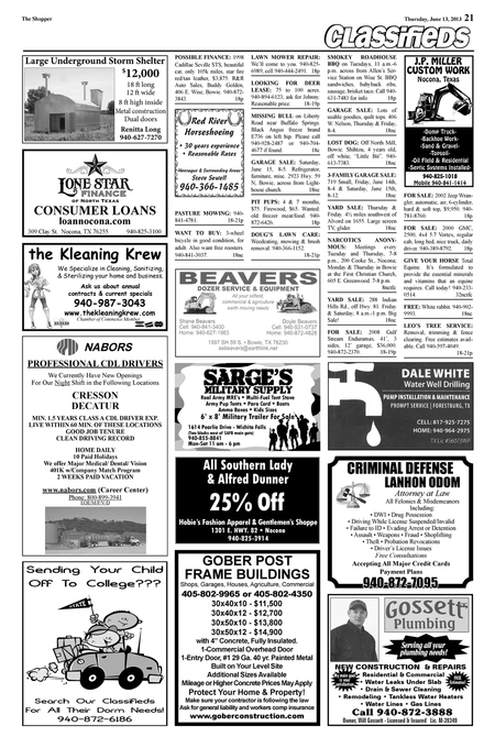 FOR SALE: 2002 Jeep Wrangler, automatic, air, 6-cylinder, hard & soft top, $9,950. 940781-8760. 18p FOR SALE: 2000 GMC, 2500, 4x4 5.7 Vortex, regular cab, long bed, nice truck, daily driver. 940-389-8792. 18p GIVE YOUR HORSE Total Equine. It’s formulated to provide the essential minerals and vitamins that an equine requires. Call today! 940-2330514. 32nctfc FREE: White rabbit. 940-9029993. 18nc LEO’S TREE SERVICE: Removal, trimming & fence clearing. Free estimates available. Call 940-597-4049. 18-21p