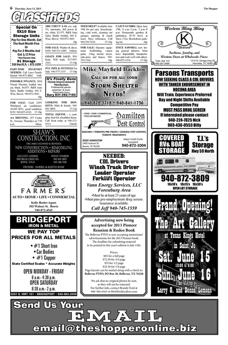 CAJUN GUMBO: Open June 17th, 11 a.m.-2 p.m., 5 p.m.-8 p.m. Homemade gumbos & jambalaya, $5.50 bowl, at Snow 2 Go, Brookshires parking lot. 18p STICE SAWMILL now hiring general laborers. Must have dependable transportation and work well with others. 940-872-1934. 17-18p