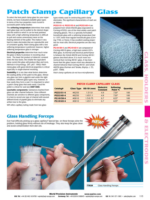 To select the best patch clamp glass for your experiments, we have evaluated available glass types in terms of the four properties most crucial to successful patch clamp studies: The softening temperature determines how easily each glass type can be pulled to the desired shape and the extent to which it can be heat polished. Glass with a high softening temperature is difficult to pull and causes unnecessary wear on the heating element of the puller. This makes it very hard to make electrodes that are reproducible and of consistent quality. Patch clamp glass with a low softening temperature is preferred; however, higher softening temperature glass is stronger. Electrical properties determine how much noise the glass is likely to produce in recording situations. The lower the product of dielectric constant times the loss factor, the smaller the equivalent noise current the glass will produce (Rae and Levis, Methods in Enzymology, 207, p67, 1992). Patch clamp glass with good electrical properties is critical especially in single-channel recording. Sealability: It is not clear what factors determine the sealing ability of the patch to the glass. Almost any glass can form a gigohm seal under the right conditions. Different glass types vary, however, in how easily they form a seal. It is important to select a patch clamp glass that seals easily. Good fire polish is critical for seal (see DMF1000). Leachable components: Substances leached from glass can alter channel behavior. Since different channels are sensitive to different glass components, it is best to record one type of channel with several different kinds of pipette glass to eliminate any artifact due to the glass. WPI offers capillary tubing made from two glass types widely used in constructing patch clamp electrodes. The significant characteristics of each are as follows: PG52151-4, PG52152-4 and PG52165-4 are prepared from Schott #8250 glass (equivalent to Corning #7052), one of the most widely used patch clamping glasses. This is a specially formulated borosilicate glass with a softening temperature that is 110°C lower than regular borosilicate glass (Corning 7740, or Pyrex). It has excellent sealing properties for most cells. Electrical properties are also very good. PG10150-4 and PG10165-4 are composed of Corning #0010 glass, a high lead content (22% PbO) glass. Its thermal and electrical performance is between the Schott #8250 and Corning #8161 glasses described above. It is much more economical than Corning #8161 glass. It has been found that this glass causes much less alteration in channel behavior than Corning #8161 and Schott #8250 glass (Furman and Tanaka, Biophys. J. 53, p287, 1988). Patch clamp capillaries do not have microfilaments.