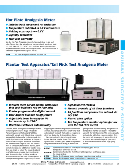 Combination Plantar/Tail Flick Meter, non-heated glass and tail temperature for mouse and rat ii-336tG Combination Plantar/Tail Flick Meter, tail temperature and heated glass for mouse and rat ii-390 Plantar Test Analgesia Meter, non-heated glass for mouse and rat ii-390G Plantar Test Analgesia Meter, heated glass for mouse and rat