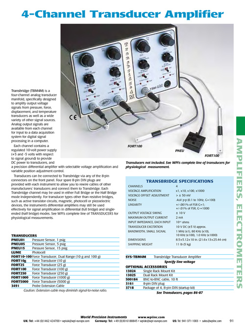 Transbridge (TBM4M) is a four-channel analog transducer manifold, specifically designed to amplify output voltage signals from pressure, force, displacement, and temperature transducers as well as a wide variety of other signal sources. Analog output signals are available from each channel for input to a data acquisition system for digital signal processing in a computer. each channel contains a regulated 10-volt power supply (+5 and -5 volts with respect to signal ground) to provide DC power to transducers, and a precision differential amplifier with selectable voltage amplification and variable position adjustment control. Transducers can be connected to Transbridge via any of the 8-pin connectors on the front panel. Four spare 8-pin DIN plugs are provided with each instrument to allow you to rewire cables of other manufacturers’ transducers and connect them to Transbridge. each Transbridge channel may be used in either Full Bridge or the Half Bridge mode independently. For transducer types other than resistive bridges, such as active transistor circuits, magnetic, photocell or piezoelectric devices, the instrument’s differential amplifiers may still be used effectively for signal amplification in differential (full bridge) and singleended (half bridge) modes. See WpI’s complete line of TrANSDuCerS for physiological measurements.