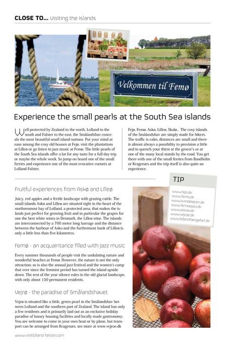 ell protected by Zealand to the north, Lolland to the south and Falster to the east, the Smålandshav conceals the most beautiful small island nations. Put your mind at ease among the cosy old houses at Fejø, visit the plantations at Lilleø or go listen to jazz music at Femø. The little pearls of the South Sea islands offer a lot for any taste for a full-day trip or maybe the whole week. So jump on board one of the small ferries and experience one of the most evocative corners at Lolland-Falster.