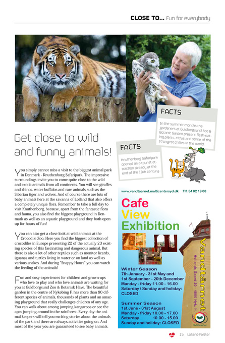 ou simply cannot miss a visit to the biggest animal park in Denmark - Knuthenborg Safaripark. The impressive surroundings invite you to come quite close to the wild and exotic animals from all continents. You will see giraffes and rhinos, water buffalos and rare animals such as the Siberian tiger and wolves. And of course there are lots of baby animals here at the savanna of Lolland that also offers a completely unique flora. Remember to take a full day to visit Knuthenborg, because, apart from the fantastic flora and fauna, you also find the biggest playground in Denmark as well as an aquatic playground and they both open up for hours of fun! ou can also get a close look at wild animals at the Crocodile Zoo. Here you find the biggest collection of crocodiles in Europe presenting 22 of the actually 23 existing species of this fascinating and dangerous animal. But there is also a lot of other reptiles such as monitor lizards, iguanas and turtles living in water or on land as well as various snakes. And during ”Snappy Hours” you can watch the feeding of the animals! un and cosy experiences for children and grown-ups who love to play and who love animals are waiting for you at Guldborgsund Zoo & Botanisk Have. The beautiful garden in the centre of Nykøbing F. has more than 90 different species of animals, thousands of plants and an amazing playground that really challenges children of any age. You can walk about among jumping kangaroos or see the apes jumping around in the rainforest. Every day the animal keepers will tell you exciting stories about the animals of the park and there are always activities going on. And most of the year you are guaranteed to see baby animals.