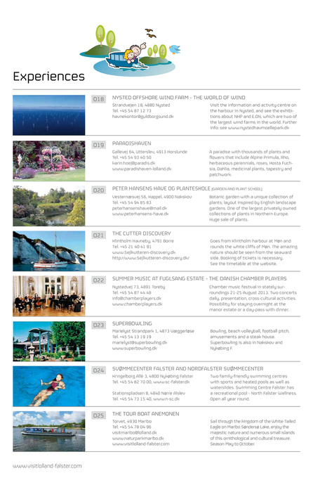 Torvet, 4930 Maribo Tel. +45 54 78 04 96 visitmaribo@lolland.dk www.naturparkmaribo.dk www.visitlolland-falster.com Sail through the kingdom of the White-Tailed Eagle on Maribo Søndersø Lake, enjoy the majestic nature and numerous small islands of this ornithological and cultural treasure. Season May to October.