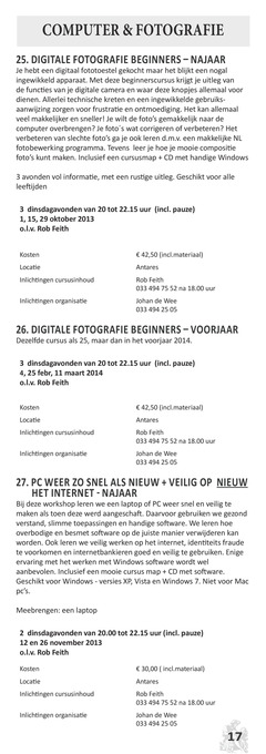 Kosten Locatie Inlichtingen cursusinhoud Inlichtingen organisatie € 42,50 (incl.materiaal) Antares Rob Feith 033 494 75 52 na 18.00 uur Johan de Wee 033 494 25 05