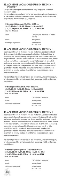 Let op! Uitsluitend portrettekenen met acryl op papier, karton of linnen( 50 x 60). Het benodigd materiaal voor de 1e les: houtskool, wiek en kneedgum, of elk ander schilder- en tekenmateriaal, papier op 50x60 cm formaat en plakband. Modelkosten: € 2,50 per les. 20 dinsdagmiddagen van 13.30 tot 16.00 uur 1, 8, 15, 29 okt - 5, 12, 19, 26 nov - 3, 10, dec 2013 7, 14, 21, 28 jan - 4, 11, 25 febr - 4, 11, 18 mrt 2014 o.l.v. Ton Kraanen