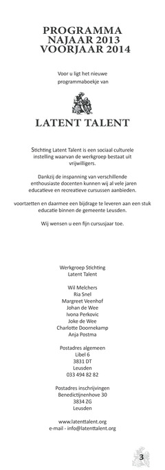 Werkgroep Stichting Latent Talent Wil Melchers Ria Snel Margreet Veenhof Johan de Wee Ivona Perkovic Joke de Wee Charlotte Doornekamp Anja Postma Postadres algemeen Libel 6 3831 DT Leusden 033 494 82 82 Postadres inschrijvingen Benedictijnenhove 30 3834 ZG Leusden www.latenttalent.org e-mail - info@latenttalent.org