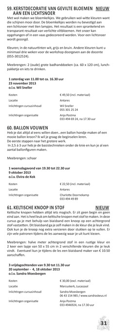 Kosten Locatie Inlichtingen cursusinhoud Inlichtingen organisatie € 49,50 (incl. materiaal) Antares Wil Sneller 055 301 25 24 Anja Postma 033 494 69 24, na 17.30 uur