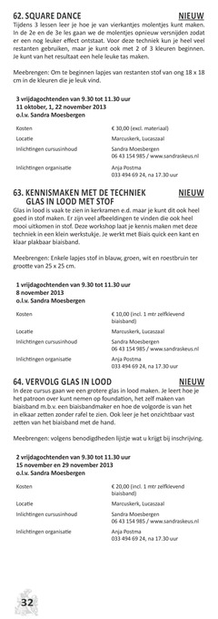 Kosten Locatie Inlichtingen cursusinhoud Inlichtingen organisatie € 30,00 (excl. materiaal) Marcuskerk, Lucaszaal Sandra Moesbergen 06 43 154 985 / www.sandraskeus.nl Anja Postma 033 494 69 24, na 17.30 uur