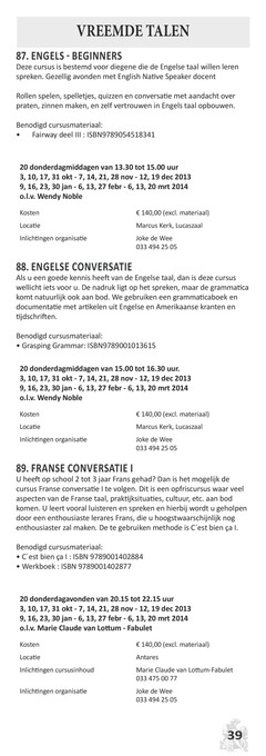 20 donderdagavonden van 20.15 tot 22.15 uur 3, 10, 17, 31 okt - 7, 14, 21, 28 nov - 12, 19 dec 2013 9, 16, 23, 30 jan - 6, 13, 27 febr - 6, 13, 20 mrt 2014 o.l.v. Marie Claude van Lottum - Fabulet