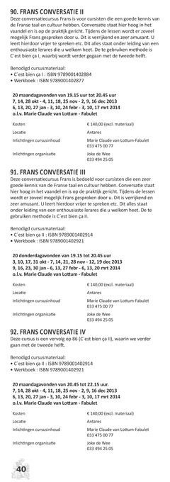 Deze cursus is een vervolg op 86 (C´est bien ça II), waarin we verder gaan met de tweede helft. Benodigd cursusmateriaal: • C´est bien ça II : ISBN 9789001402914 • Werkboek : ISBN 9789001402921 20 maandagavonden van 20.45 tot 22.15 uur. 7, 14, 28 okt - 4, 11, 18, 25 nov - 2, 9, 16 dec 2013 6, 13, 20, 27 jan - 3, 10, 24 febr - 3, 10, 17 mrt 2014 o.l.v. Marie Claude van Lottum - Fabulet